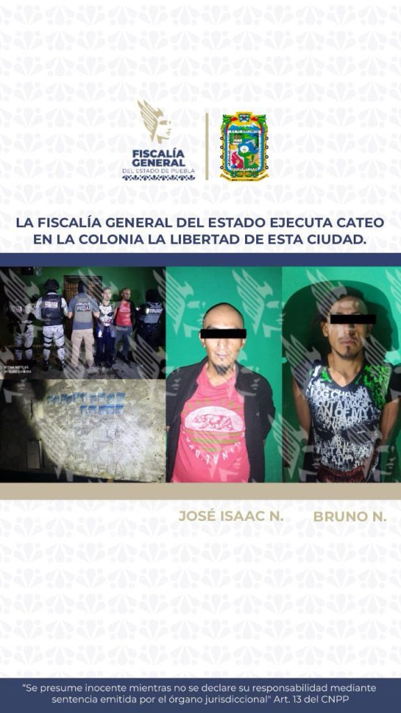 A través de un comunicado, la dependencia dio a conocer la detención de tres hombres, identificados como José Isaac N., Bruno N., y Victor N; todos aprehendidos durante dos cateos simultáneos que se llevaron a cabo en las últimas horas en los municipios de Puebla y Chietla.