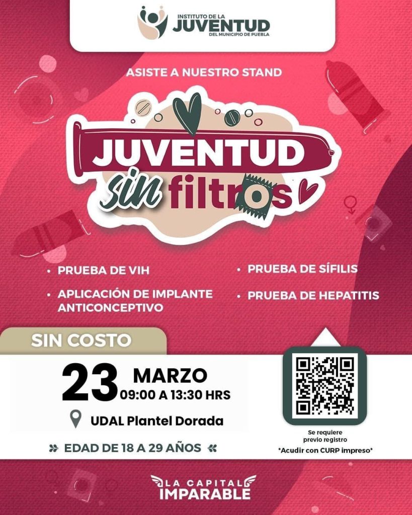 El Ayuntamiento de Puebla, a través del Instituto de la Juventud del Municipio, invitó a jóvenes a participar en el stand “Juventud sin Filtros”, donde se ofrecerán servicios gratuitos de salud sexual.